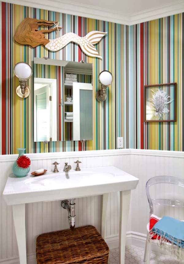En el primer espacio, un zócalo a media altura pintado de blanco, encuentra un contrapunto en un papel pintado de diseño colorista. Con un patrón de líneas verticales, esta pared se convierte en un punto focal y aporta un efecto de mayor altura. Mientras las paredes se adornaron con figuras marinas que aportan un guiño simpático y dinámica al interior.