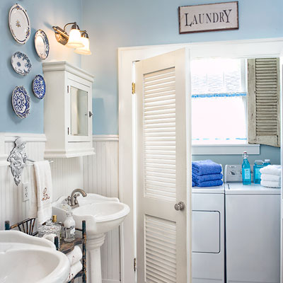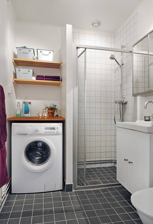 Es recomendable utilizar el espacio vertical, montando baldas, estanterías, o alacenas. Estos muebles ofrecen mas espacio de almacenaje ideal para guardar toallas, jabones y los productos que se usan para el lavado, a su vez son perfectos elementos para delimitar el área del baño que dedicamos al cuidado de la ropa.
