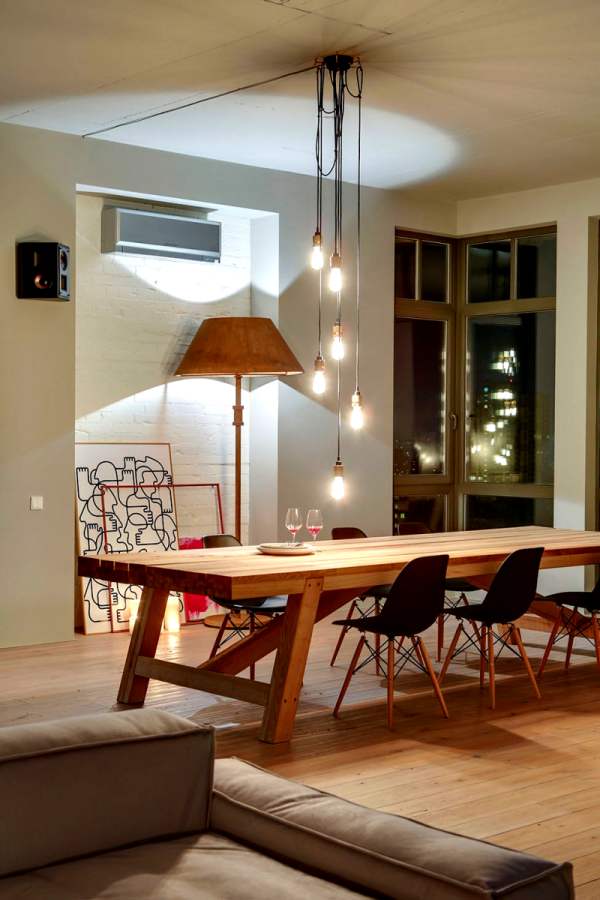 La iluminación se conforma por una serie de bombillas desnudas, un punto de tendencia, y que aportan luz puntual a la zona de la mesa. El entorno se enriquece con lámparas de pie que ofrecen un toque decorativo y también son prácticas para crear ambiente.
