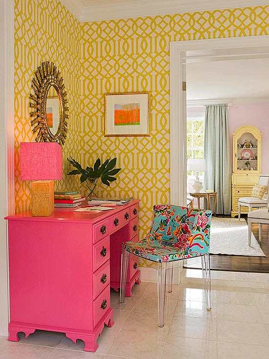 Una oficina multicolor y con un aire femenino es la propuesta que nos trae este espacio, en el que dominan la escena los contrastes y la dinámica que aportan los estampados.