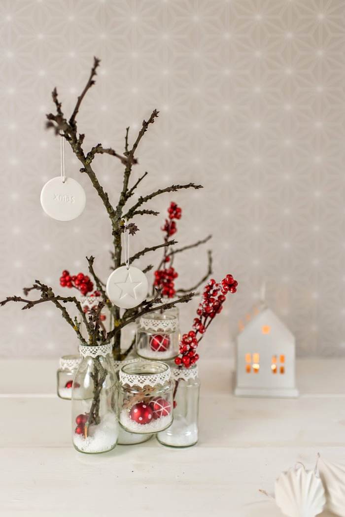 En este caso, el esquema cromático escogido incluye un dúo clásico en Navidad: rojo y blanco, que se complementa con la madera de las ramas. Unas cintas o encajes serán el detalle decorativo final para los recipientes de vidrio y unas ramas secas completan el conjunto. Así es que con muy poco puedes conseguir una composición siempre única y con toques naturales y encantadores.