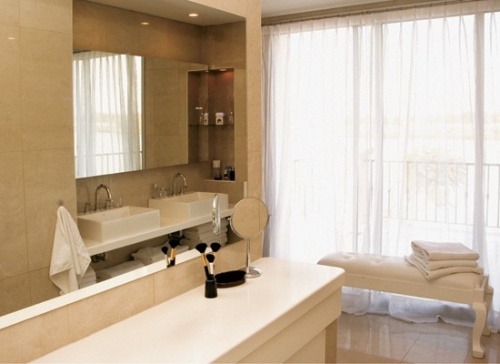 En el dormitorio principal, un juego de muebles recubiertos con espejos, que añaden un toque chic y luminoso a la decoración de un dormitorio, que se extiende hacia el exterior en un espacioso balcón.