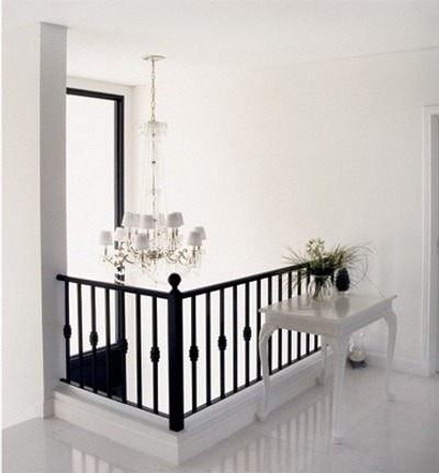 Complementos decorativos de estilo vintage, como una araña de bronce con caireles de cristal, aportan estilo y personalidad a esta casa moderna y blanca.