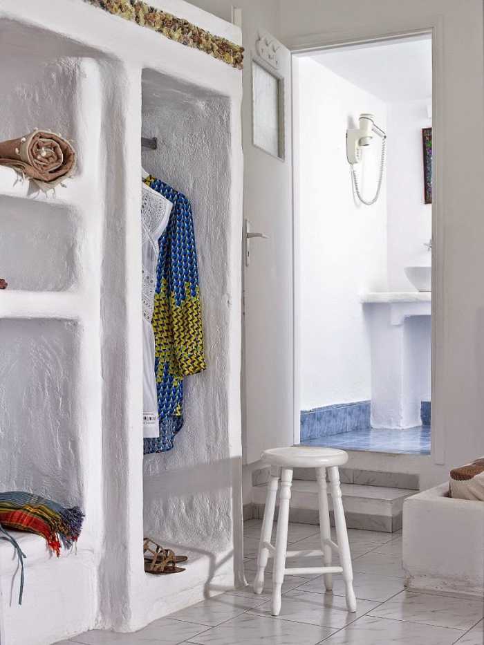 Las paredes encaladas y de un blanco absoluto se integran con el mobiliario, formado por muebles de obra, un elemento característico de esta arquitectura. Para el almacenaje se han previsto armarios abiertos, los que potencian una impronta despojada y resultan prácticos para tener todo al alcance de la mano.