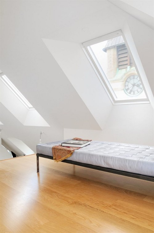 El interiorismo y la arquitectura de este piso en Suecia, tienen un especial atractivo. Existen irregularidades en la estructura de esta Casa Moderna, que han sido aprovechadas, desarrollando funciones allí, como un pequeño espacio de trabajo que se ubicó de modo tal de sacar provecho de la doble altura del ático. O bien, las diversas ventanas distribuidas en distintos ángulos de la cubierta.