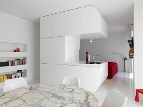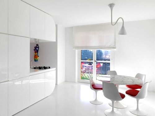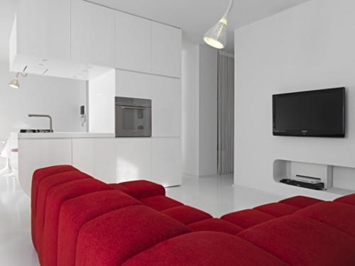 Una combinación de colores con la que se pueden lograr interesantes resultados, es la de la pareja rojo y blanco, que es la encargada de revitalizar los espacios de este piso ultra moderno. El esquema cromático elegido aplicado a los muebles de estética depurada, aporta interés visual y un toque de calidez.