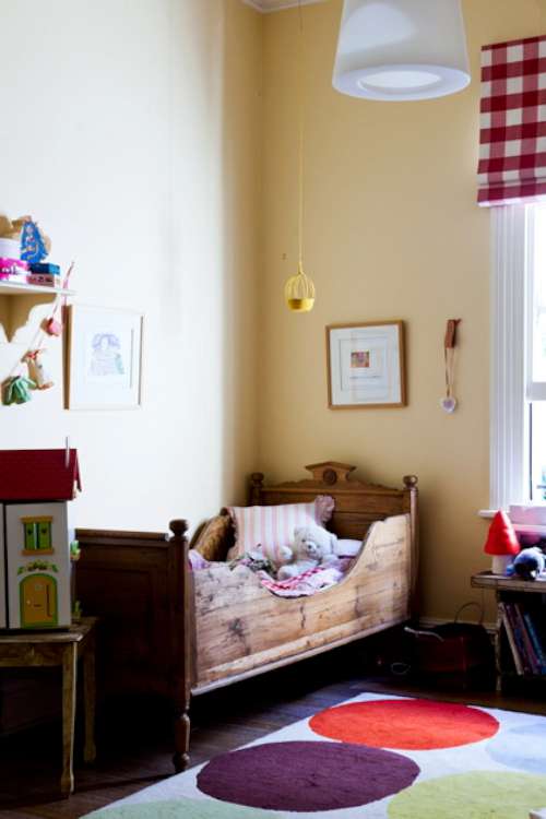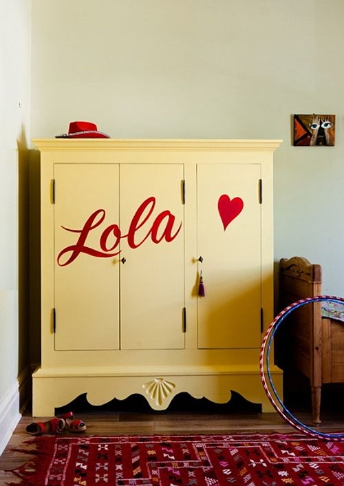 En uno de los dormitorios de niños, un armario pintado de amarillo es una nota importante nota de color, que ayudado por una tipografía que lo recorre y que lleva el nombre de la habitante de esta habitación, se convierte en un punto de atracción. Pinturas que encuentran una disposición que permite apreciarlas a la perfección, una amplia alfombra de estilo marroquí, son algunos otros guiños que definen la personalidad de la decoración de este hogar.