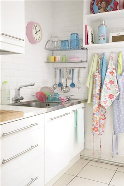 - En la cocina, crea un rincón con elementos que pueden ser accesorios y menaje que usas a diario, (como paños de cocina, bandejas, vasos, cucharones), y que tengan un común denominador, como es la paleta de colores o los materiales.