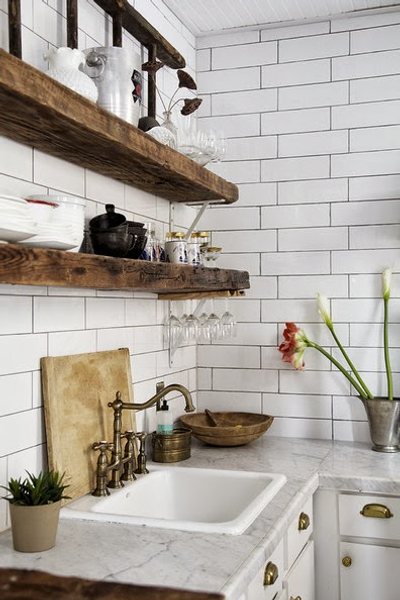 En lugar de las tradicionales alacenas o gabinetes superiores, aquí se han montado unas estanterías abiertas, que aportan espacio de almacenaje, más una estética actual y fresca a la decoración.