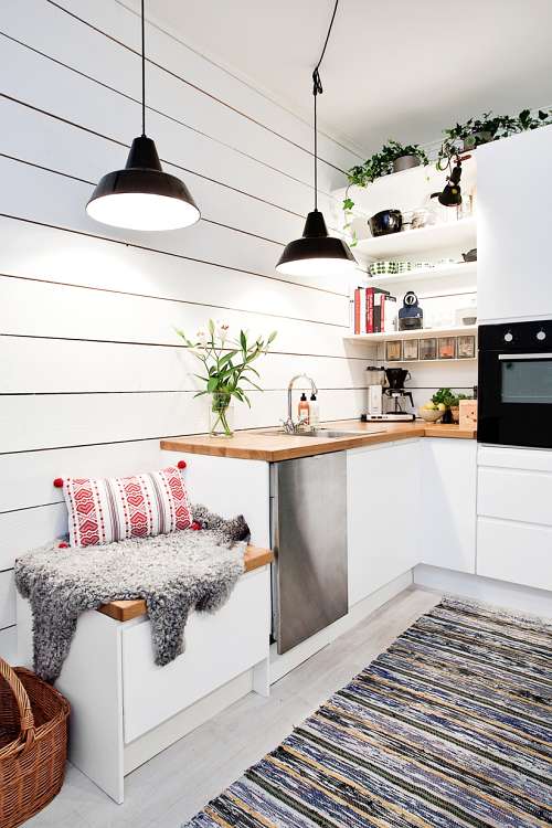En esta cocina un rincón del mobiliario reserva un espacio de almacenaje, que a la vez sirve como un asiento extra, allí una piel suma calidez mientras un cojín añade colorido y texturas a este ambiente.