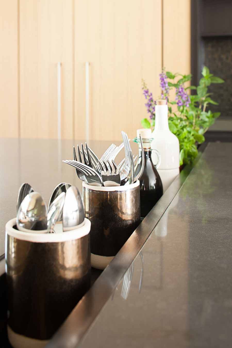 Esta isla central se convierte en el elemento estrella de este interior. Se trata de un diseño de grandes dimensiones, que incluye una amplia superficie de apoyo que se puede utilizar para comer y trabajar, y está rodeada de taburetes. Pero además tiene un toque que se destaca, en el centro de la encimera se ha previsto un hueco que alberga diferentes objetos, desde frascos con especias, menaje y hasta plantas aromáticas que se usan en las recetas que se preparan en esta cocina.
