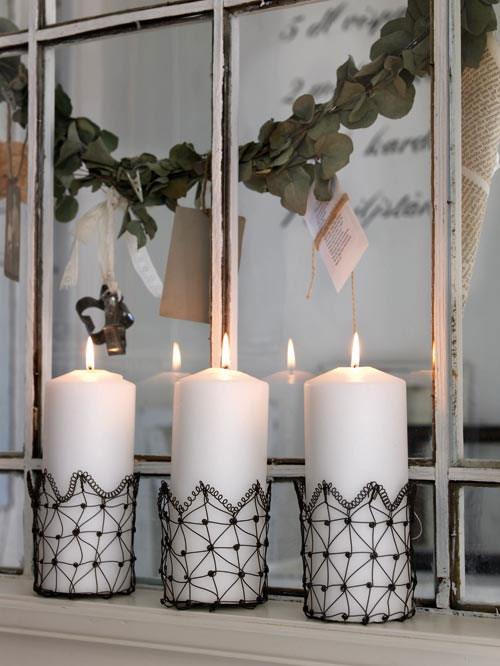 - Además, unas sencillas velas blancas las podemos decorar y añadir un aire navideño con simples detalles como cintas o algún detalle con estampados o formas que se adecuen a la celebración.