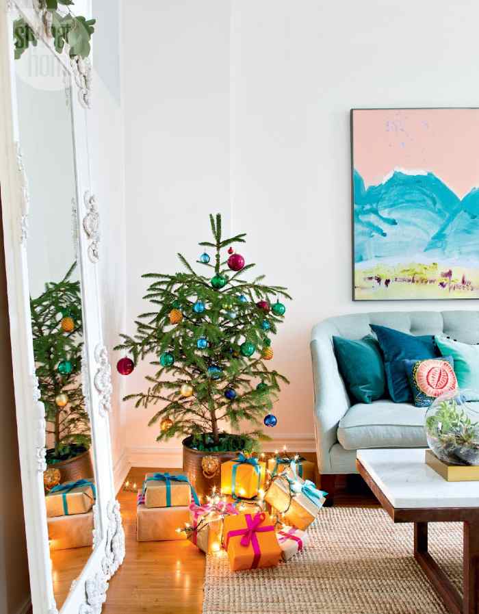 Aprovecha, por ejemplo, la presencia del árbol de Navidad en el salón para crear una atmósfera acogedora y con estilo. Para lograrlo puedes iluminarlo desde la base, solo colocando una guirnalda de luces a su alrededor y a ras de piso. El ambiente se inundará con un juego de luces y sombras atractivo.