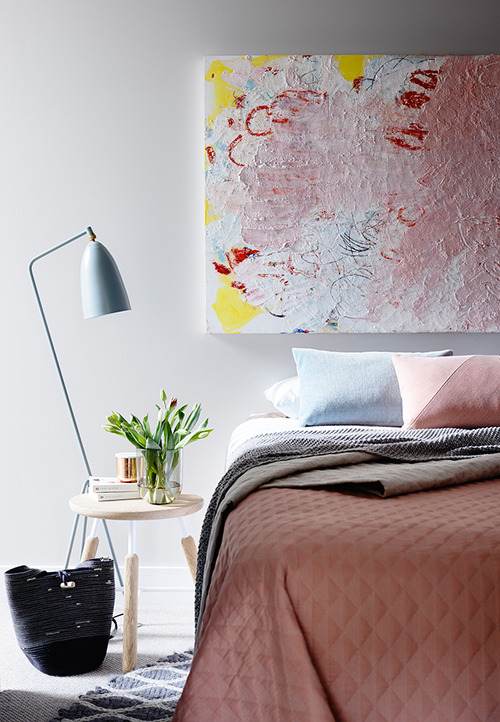 Una pieza de arte de gran porte se puede convertir en un punto focal, que añade texturas, colores, y una singular dinámica al espacio, funcionando como un marco que personalice la cama.