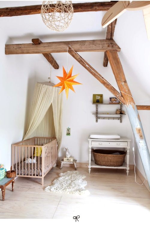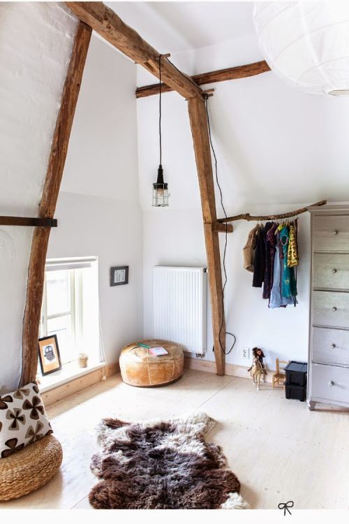 Paredes blancas y suelo de madera clara, crea un conjunto acogedor y luminoso, que se completa con la presencia de las vigas vistas que recorren la estancia de suelo a techo. Mientras una ventana a al altura del suelo, es un interesante guiño de la arquitectura que invita a disfrutar la cálida luz natural.