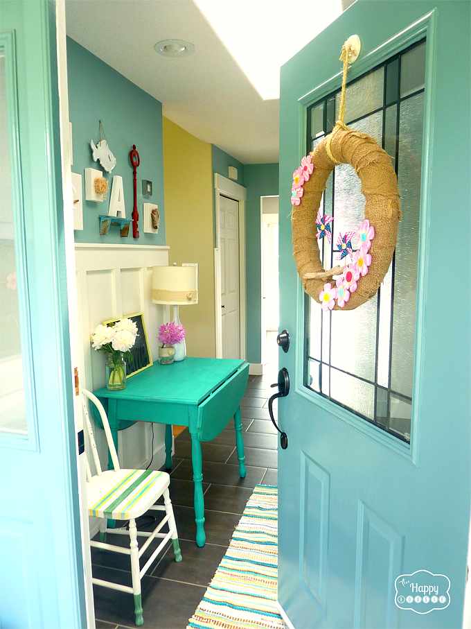 Flores y pequeños detalles aportan notas coloridas y alegres a esta zona de entrada, que se convierte en un ambiente con aire de verano, funcional y actual.