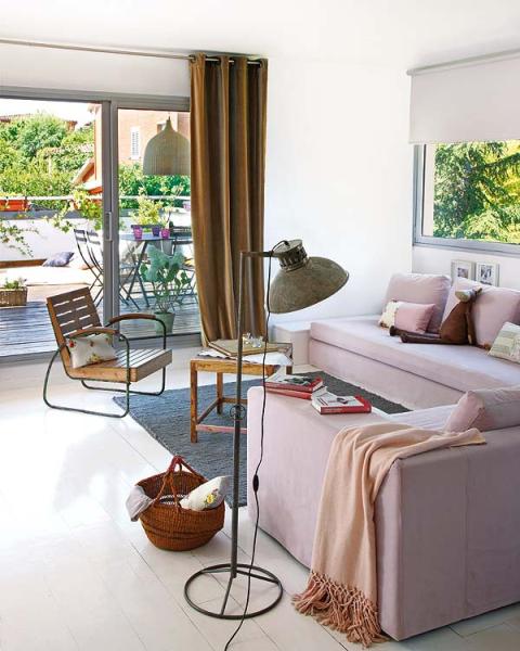 La mezcla de muebles no solo suma una estética interesante, pues también aporta dinámica al ambiente, con piezas versátiles. Por un lado el sofá amplio y confortable, tapizado con un color rosa palo, mas una silla y una mesa de centro, diseños con estructuras de metal oxidadas y maderas desgastadas, piezas recicladas que aportan un guiño vintage a la decoración.