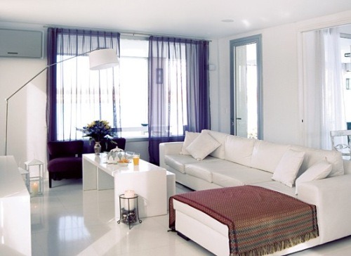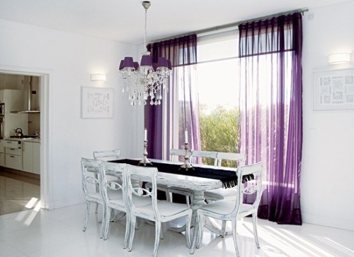 En algunas habitaciones, como el comedor, se usó una combinación de blanco y morado, una mezcla que confiere una atmósfera romántica y distinguida a la decoración de esta estancia.